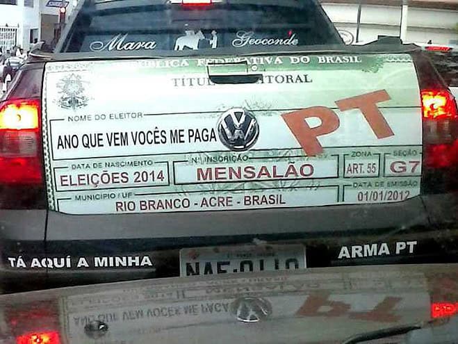 Com apenas dois dias de publicação, imagem de um carro com adesivagem que reproduz o título eleitoral e faz alusão ao esquema de corrupção G7 – suposta formação de cartel no governo de Sebastião Viana (PT) ainda não julgado pela Justiça – faz sucesso no Facebook, “Tá aqui a minha arma PT”, diz à publicação que já tem mais de mil compartilhamentos.Endereço no Face: https://www.facebook.com/tiago.sales.758