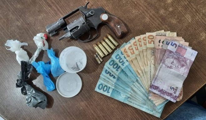 Ao chegarem na residência indicada, foram encontradas duas munições calibre .22 intactas e uma caixa de som de procedência duvidosa. Na casa ao lado, foi encontrado um revólver calibre .38 sem numeração legível, mais cinco munições intactas, um frasco contendo uma substância aparentando ser cocaína, vários sacos geralmente utilizados para o embalo de drogas, além da quantia de 1.360 reais em cédulas.