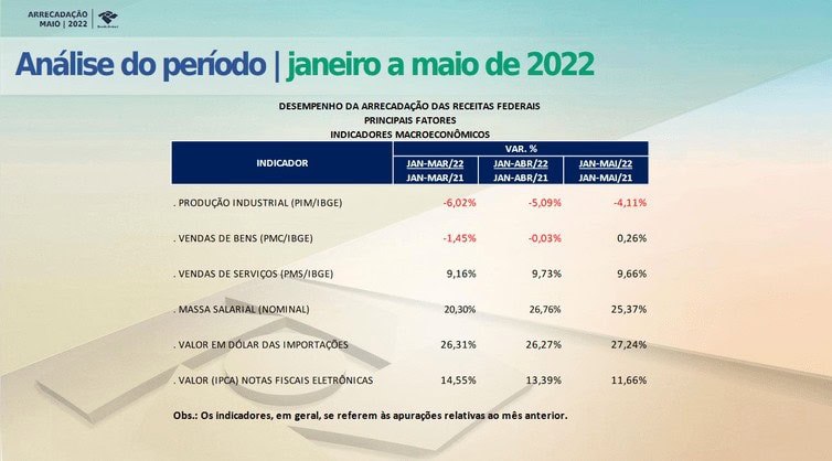 Os principais indicadores traçam uma melhora da atividade econômica entre janeiro e maio deste ano, o que também ajuda a explicar a alta da arrecadação (veja na tabela abaixo). Um dos destaque foi o crescimento de 27,2% da arrecadação obtida a partir dos valores em dólares das importações, quando comparados os meses de maio de 2021 e de 2022.