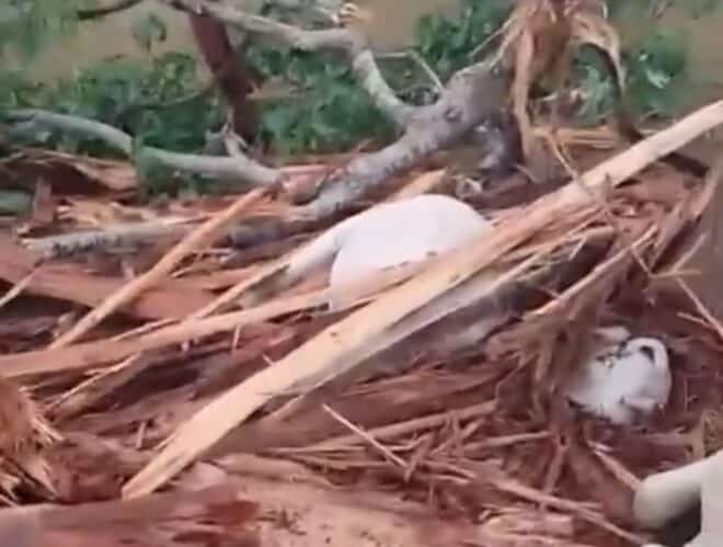 Segundo informações, uma árvore caiu durante a ventania a atingiu o gado, que repousava sob ela. Nas imagens é possível ter dimensão do incidente.