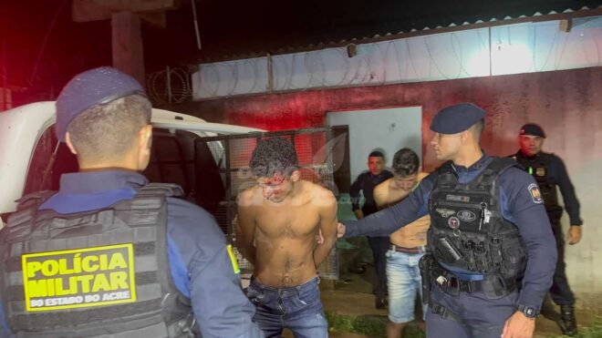 Na noite desta quinta-feira (23), os assaltantes Francisco Pereira Cavalcante, 19 anos, e Carlos Henrique Dantas Cavalcante, 22, foram detidos pela polícia após uma tentativa de arrastão na Praça do bairro João Eduardo 2, na região da Baixada da Sobral, em Rio Branco.
