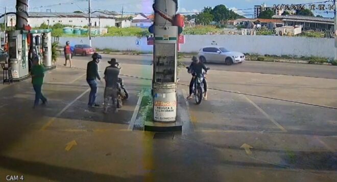 A ação começa quando o primeiro assaltante aborda um entregador e toma a chave de sua motocicleta. Em seguida, o comparsa se dirige ao frentista, obrigando-o a entregar o dinheiro que estava no caixa. Um cliente que abastecia seu veículo também foi abordado e teve a chave de sua moto roubada.