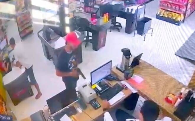 Câmeras de segurança flagraram toda a ação. Nas imagens, os suspeitos entram rapidamente, anunciam o assalto em tom de ameaça e exigem dinheiro do caixa, além de celulares e objetos pessoais das vítimas.