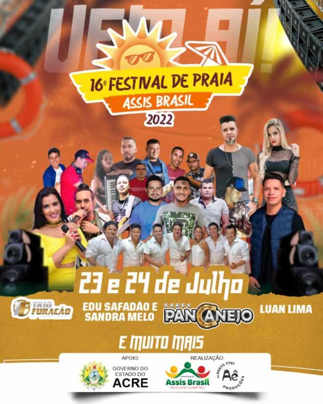 A Prefeitura de Assis Brasil confirmou para os dias 23 e 24 de julho a realização da 16ª edição do Festival de Praia. O evento é uma tradição na região de fronteira e costuma reunir milhares de pessoas de diversas regiões do estado do Acre, além dos países Peru e Bolívia.