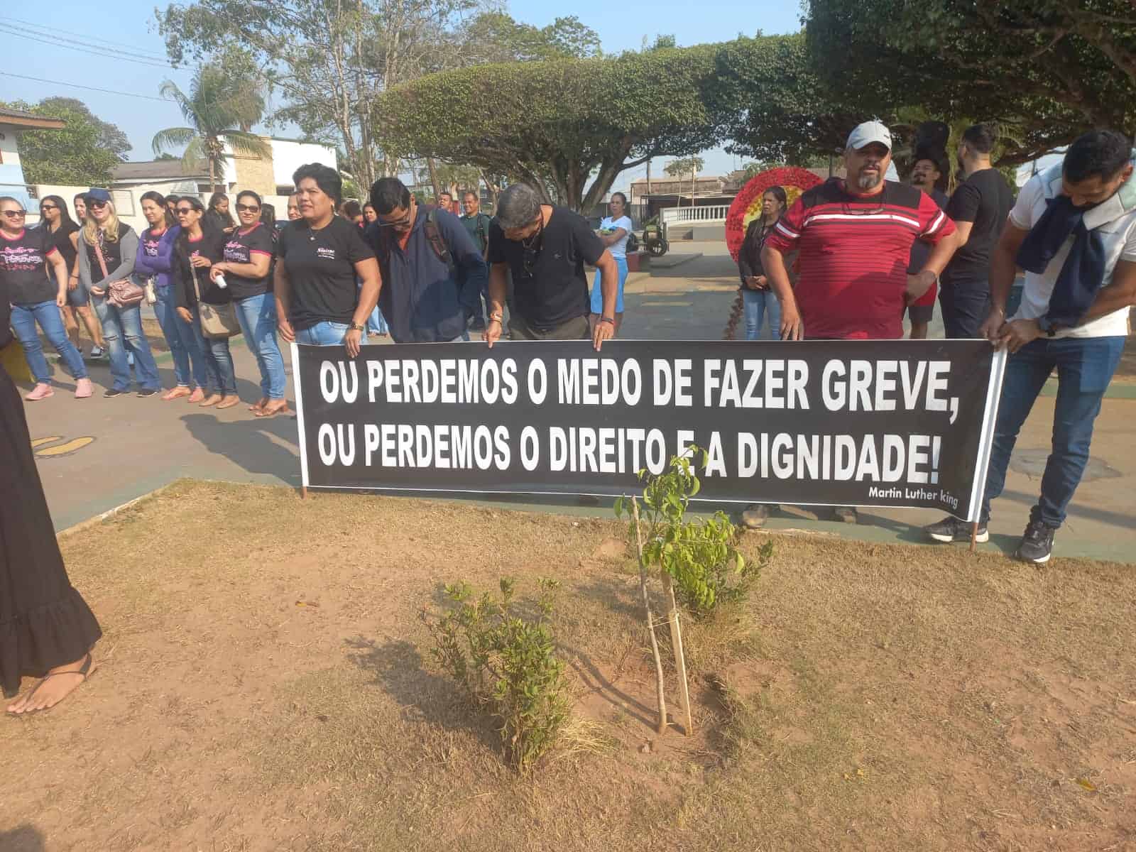 Nesta terça-feira 13, pela manhã ouve encontro com docentes de Epitaciolândia e Brasiléia na praça em frente a escola estadual Joana Ribeiro Amed, na deliberação da categoria foram decididos vários pontos da greve estadual. Foto: cedida