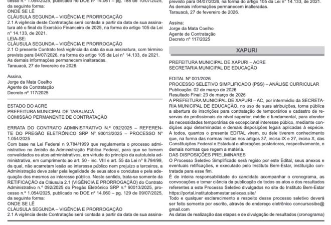 A Prefeitura de Xapuri publicou nesta terça-feira (3) cinco editais de processos seletivos simplificados para contratação temporária e formação de cadastro de reserva em diferentes setores da administração municipal. Os documentos foram divulgados no Diário Oficial e integram um único arquivo oficial.