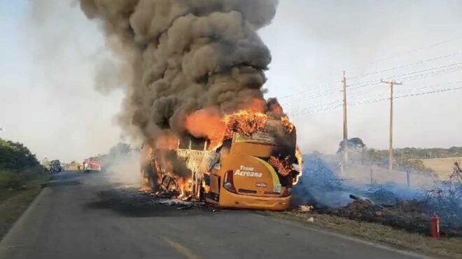 Um ônibus leito da empresa Trans Acreana, que faz linha interligando os municípios de Brasiléia/Assis Brasil, foi consumido pelo fogo quando trafegava pela BR 317 – Estrada do Pacífico na tarde desta quinta-feira, dia 18. O sinistro ocorreu no km 26.