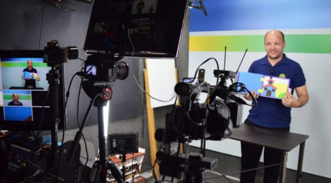 Profissionais gravam programas de vídeo destinados aos estudantes da rede pública; gravações têm a participação de intérpretes de Libras. Foto: Mardilson Gomes/SEE