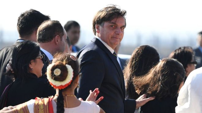 O presidente Jair Bolsonaro desembarcou em Nova Déli, na Índia, onde participa de reuniões para estreitar relações comerciais Imagem: Prakach Singh/AFP