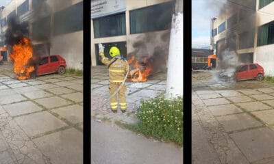 Fiat Pálio teve a parte frontal destruída; bombeiros agiram rápido e evitaram que as chamas consumissem todo o veículo. Um Fiat Pálio vermelho ficou parcialmente destruído...