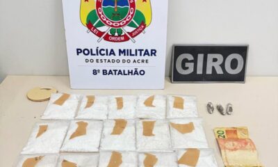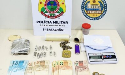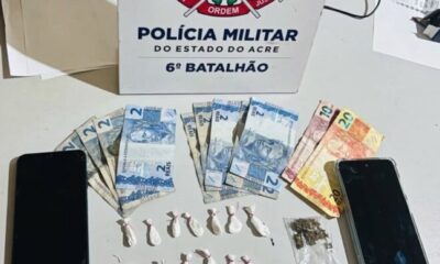 Durante patrulhamento, policiais encontraram 167g de maconha, 7g de cocaína e R$ 903 em espécie; material estava embalado para venda Na noite deste sábado (19), policiais...
