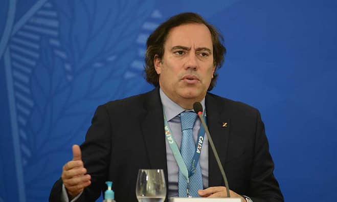 O presidente da Caixa Econômica Federal, Pedro Guimarães, fala à imprensa no Palácio do Planalto,sobre o o pagamento da 2ª parcela do auxílio emergencial