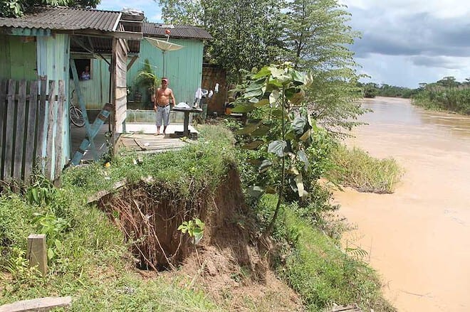 A acelerada erosão nas margens do rio Acre, na divisa entre as duas nações, está perto de fazer com que parte da cidade de Brasileia, no Acre, perca a ligação terrestre com o resto do município, tornando-se uma ilha cercada pela Bolívia.