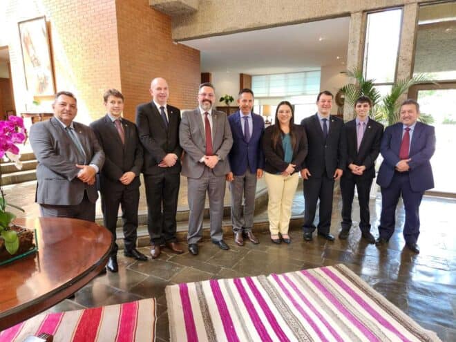 A Bancada Federal do Acre foi recebida, nesta quinta-feira, 16, na Embaixada do Peru, em Brasília. Além de recepcionar oficialmente os parlamentares eleitos e reeleitos, o convite do Embaixador Rómulo Acurio teve como objetivo a discussão de pautas que precisam de apoio dos deputados e senadores, uma vez que o estado faz fronteira com o Peru.