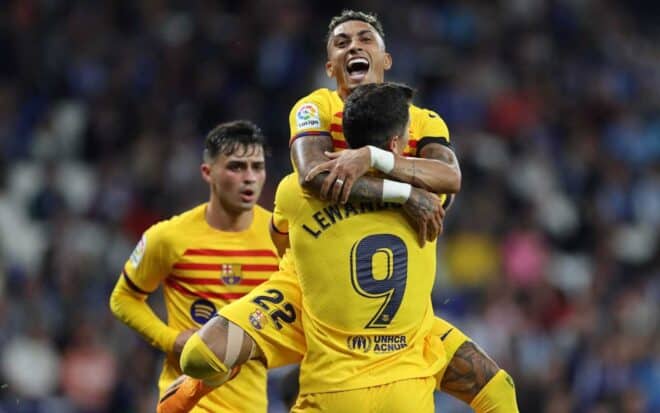 A primeira chegada do Barcelona foi aos seis minutos. Koundé fez jogada de ultrapassagem pela direita, cruzou rasteiro para Pedri, dentro da área, mas o jovem finalizou para fora, assustando a equipe do Espanyol.