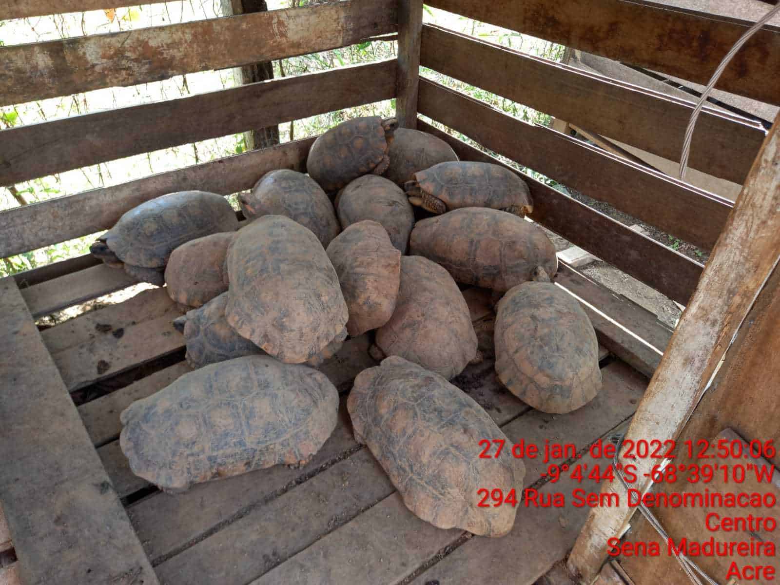 Com informações que no referido local um indivíduo mantinha vários jabutis para comercialização, a equipe policial se deslocou a zona rural de Sena Madureira para averiguar o fato. Chegando ao endereço encontrou o suposto envolvido que negou comercializar os animais, porém ao adentrar e verificar a denúncia, os militares constataram a veracidade dos fatos, encontrando ao todo 24 jabutis. O envolvido não afirmou ser proprietário de todos os animais.