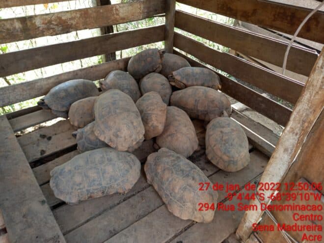 Após uma denúncia anônima, militares do Batalhão de Policiamento Ambiental (BPA) conseguiram apreender 24 quelônios (jabutis), na quinta-feira, 27, no município de Sena Madureira.