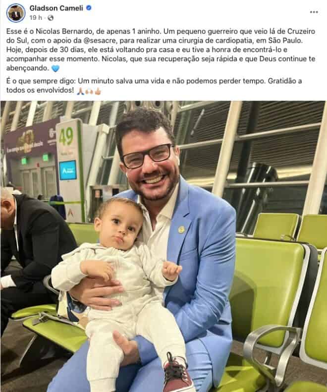 O governador Gladson Cameli usou suas redes sociais para comemorar o sucesso da cirurgia cardíaca realizada no bebê Nicolas Bernardo, de apenas um ano. A criança, natural de Cruzeiro do Sul, viajou para São Paulo com apoio da Secretaria de Estado de Saúde (Sesacre) para realizar o procedimento.
