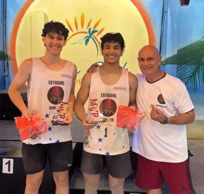 Foto AAVP: Felipe, Biel e o professor Cláudio Baixinho no Prainha Beach