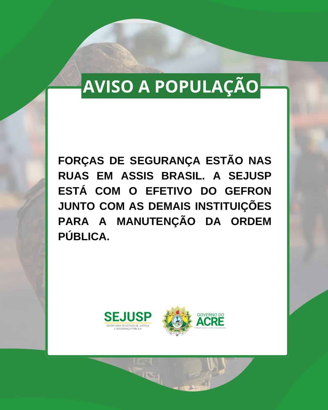 A Secretaria de Estado de Justiça e Segurança Pública do Acre (Sejusp) através do Grupo Especial de Operações em Fronteiras (Gefron), vem a público desmentir o aviso que circula sobre a possibilidade de conflitos entre grupos criminosos no município Assis Brasil.