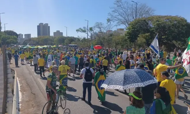 O ato, que percorreu parte do Eixão da Asa Sul, região central da capital federal, foi organizado por políticos de direta como a senadora Damares Alves (Republicanos-DF) e a deputada Bia Kicis (PL-DF).