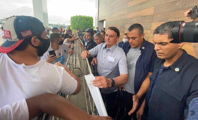 Faltando poucas minutos para o sobrevoou, um pequeno e tímido grupo se reuniu num cercado. O objetivo é tentar um contato mais próximo com o chefe-maior de Estado. Assim que desembarcou, Bolsonaro foi ao espaço e acenou para os presentes.