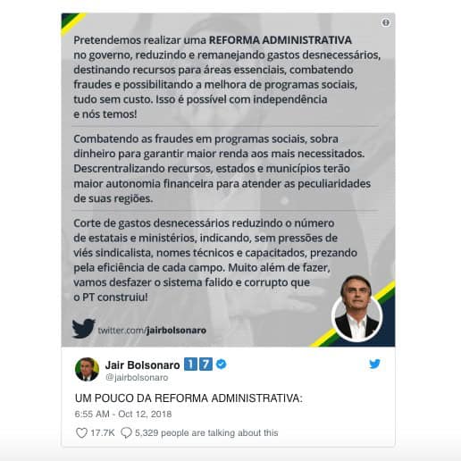 O candidato do PSL à Presidência da República, Jair Bolsonaro, defendeu nesta sexta-feira (12), em uma rede social, uma reforma administrativa como forma de reduzir e remanejar “gastos desnecessários” e, assim, destinar mais recursos para áreas consideradas “essenciais”.