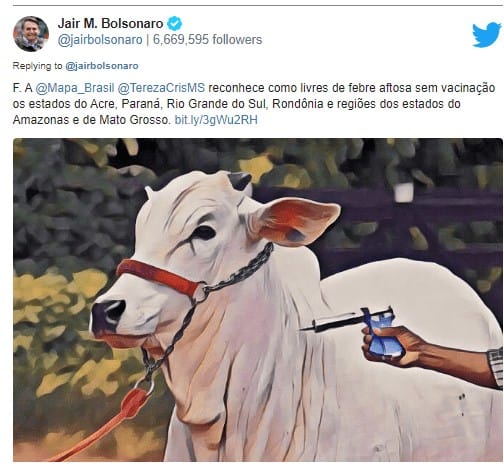“(…) reconhece como livres de febre aftosa sem vacinação os estados do Acre, Paraná, Rio Grande do Sul, Rondônia e regiões dos estados do Amazonas e de Mato Grosso”, postou o mandatário da Nação Brasileira.