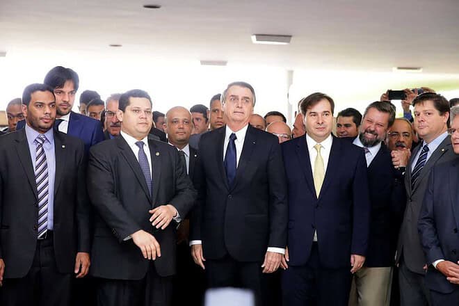 Bolsonaro e os ministros foram recepecionados pelos presidentes da Câmara, Rodrigo Maia (DEM-RJ), e do Senado, Davi Alcolumbre (DEM-AP).