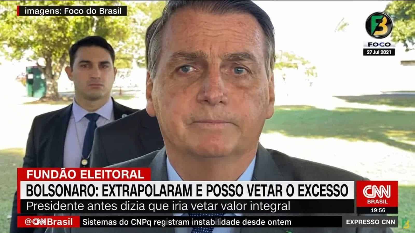 Apesar da declaração, o presidente da República não disse anteriormente que o veto seria parcial. “Vou vetar [o valor do fundo eleitoral] e fica na mão do parlamento derrubar o veto ou não”, disse Bolsonaro para a rádio Jovem Pan de Itapetininga.