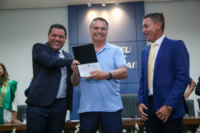 O ex-presidente da República, Jair Messias Bolsonaro, recebeu na manhã desta sexta-feira, 22 de fevereiro, o título de Cidadão Rio-branquense, durante sessão solene promovida pela Câmara de Vereadores, no auditório da Federação das Indústrias do Acre (Fieac). A entrega foi feita pelo vereador João Marcos Luz (PL), autor do projeto que conferiu a comenda.