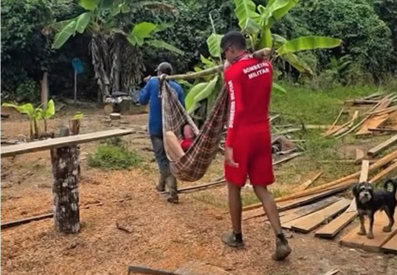 Vítima foi retirada em rede e transportada por via fluvial após cerca de duas horas de navegação pelo Rio Macauã; fortes chuvas dificultaram o acesso terrestre