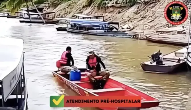 A guarnição foi acionada para atender a ocorrência e realizou deslocamento fluvial de aproximadamente 1h30 até a região ribeirinha. No local, os militares encontraram a vítima sendo transportada por moradores da comunidade.