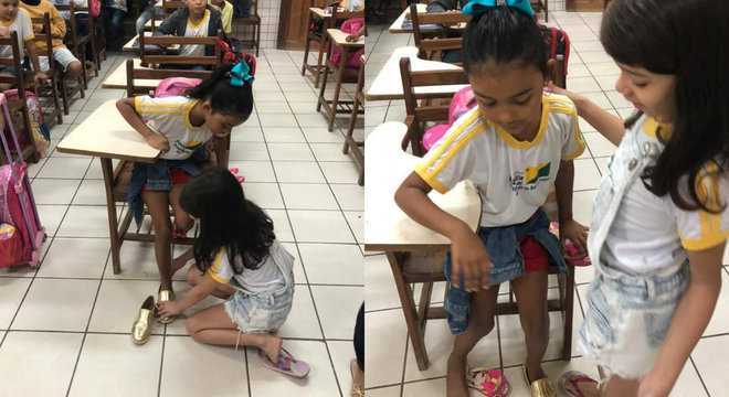 “Ela se dirigiu a uma colega, que levantou o braço dizendo eu calço 27 e mostrou sua sandália, se ajoelhou e colocou o sapato no pé da colega. Que possamos ser sempre iguais às crianças.”