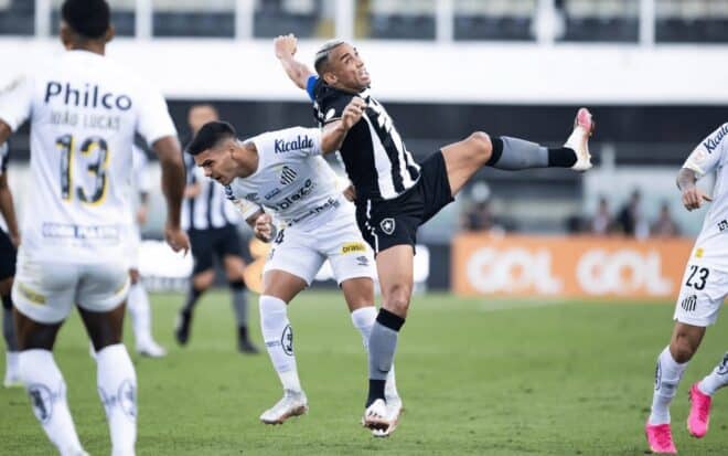 Marçal e Rodrigo Fernández divide bola no empate entre Santos e Botafogo (Foto: Abner Dourado/AGIF)