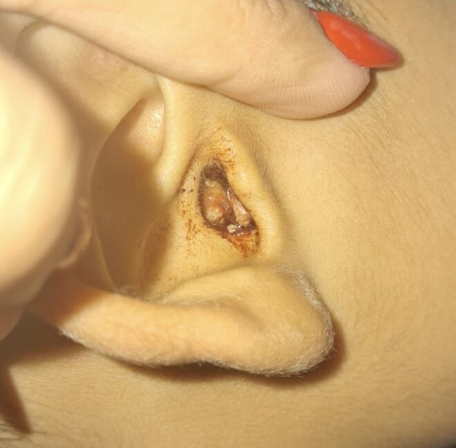 De acordo com a mãe da criança, o ouvido do menino apresenta pus visível, dor constante e não responde aos medicamentos prescritos por médicos clínicos gerais. Foto: captada