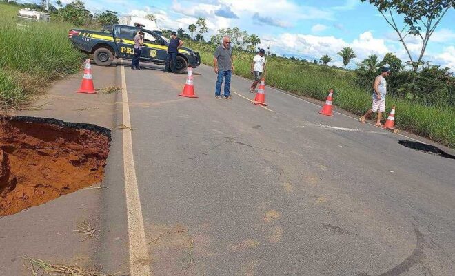 Uma erosão provocada pelo rompimento de um bueiro metálico a 10 quilômetros do distrito de Extrema, na BR-364, entre Rondônia e Acre, obrigou a Polícia Rodoviária Federal a interditar a rodovia na tarde deste domingo (19). O trecho pode apartar a qualquer momento.