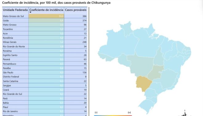 Com 13 casos prováveis de chikungunya registrados nas duas primeiras semanas epidemiológicas de 2026, o Acre ocupa a 4ª posição no ranking nacional de coeficiente de incidência da doença, com índice de 1,5 caso a cada 100 mil habitantes. Apesar da colocação no cenário nacional, o estado não registrou óbitos até o momento. Os dados são do Painel de Arboviroses do Ministério da Saúde.