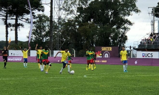 A seleção masculina de futebol de surdos tropeçou na estreia contra Camarões, ao ser superada por 3 a 2 na manhã deste sábado (30), em duelo realizado na Fundação Marcopolo, em Caxias do Sul (RS), pela primeira rodada da modalidade na Surdolimpíada. A abertura oficial da 24ª edição do evento, que ocorre pela primeira vez na América Latina, está programada para às 18h (horário de Brasília) deste domingo (1º de maio), no Ginásio do Sesi. O próximo duelo da seleção brasileira será segunda-feira (2), às 14h, no campo do Gianella, com transmissão ao vivo online.