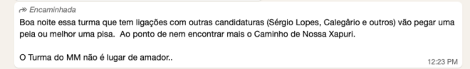 Prints enviados aos atuais vereadores soam como represália local. As mensagens afirmam que candidatos de outras regiões não poderiam ter ligações com vereadores de Xapuri, sob ameaça de violência. “Vão tomar uma peia, ou melhor, uma pisa ao ponto de não reencontrar o caminho de Xapuri”, diz uma das publicações que circula entre os parlamentares.