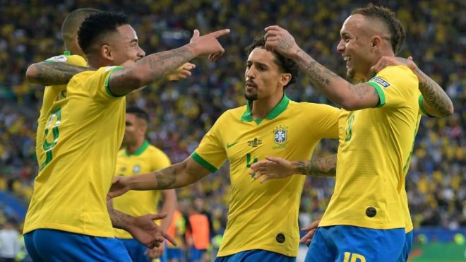 BRASIL: Alisson; Daniel Alves, Marquinhos, Thiago Silva e Alex Sandro; Casemiro, Arthur e Philippe Coutinho (Éder Militão); Gabriel Jesus, Éverton (Allan) e Roberto Firmino (Richarlison). Técnico: Tite.