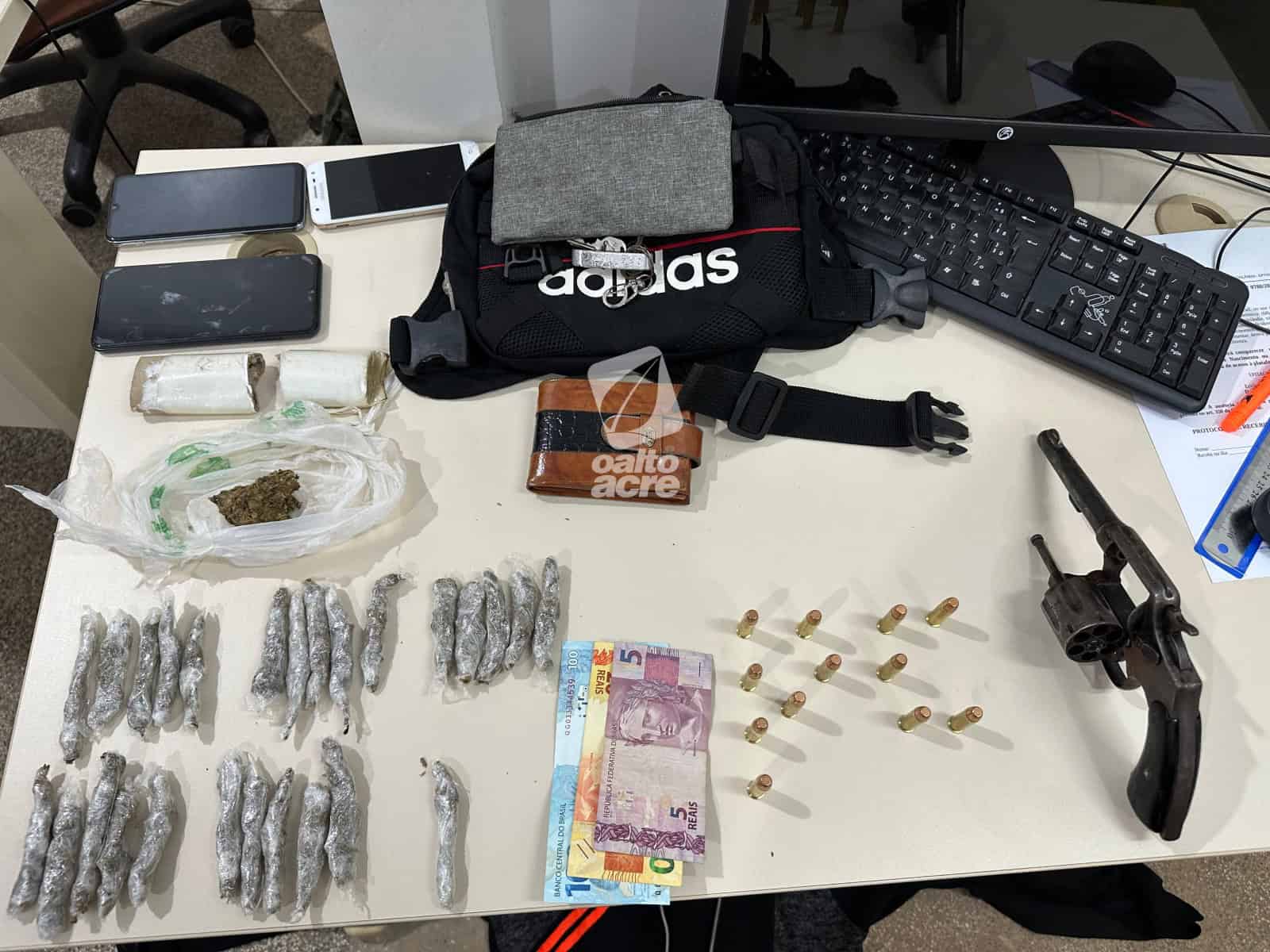 Ao todo, foram apreendidos um revólver calibre 38, 12 munições intactas, 73,7 gramas de maconha, R$ 125 em dinheiro, um aparelho celular e um moletom preto.