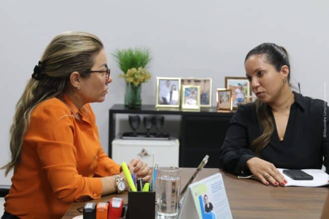 Prefeita Fernanda Hassem com a Diretora Presidente do Procon no Acre, Alana Albuquerque, no gabinete para tratativas de alinhamento - Foto: Alexandre Lima
