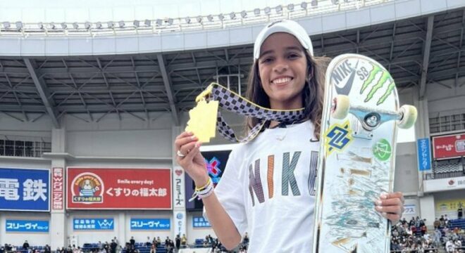 “Minha primeira medalha no X Games é douradinha. Mais uma medalha do Japão para o Brasil. Obrigada pela torcida, galerinha”, escreveu Rayssa, emocionada, no Twitter.