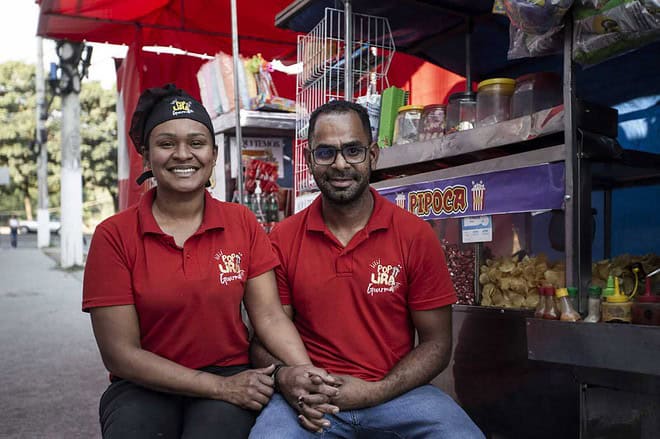 Hoje Júnior comanda ao lado da mulher, Joyce, 34 anos, um negócio próprio de comida de rua. São quatro carrinhos que vendem cachorro-quente, pipoca, açaí, milho e churros no bairro do Jaraguá, zona norte de São Paulo, e outros seis que trabalham em eventos. O faturamento da família gira em torno de R$ 20 mil ao mês. Para os padrões socioeconômicos brasileiros, Júnior saiu da classe E para a A.
