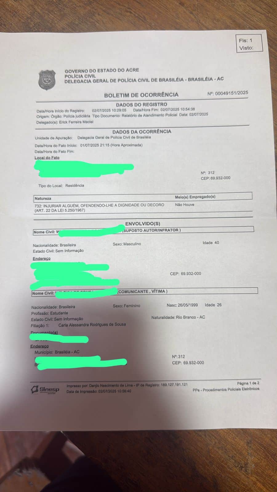 Boletim de Ocorrência registrado na Delegacia de Policia Civil de Epitaciolândia – Acre