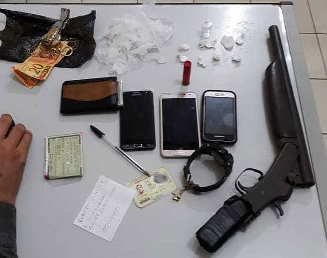 Na casa, a mulher teria tentado ludibriar os policiais, mas foi localizada onde havia comentado. A espingarda calibre .28 de cano serrado, transformada em escopeta. Foi quando descobriram algumas trouxinhas de cocaína e R$ 40 reais proveniente da venda e também comercializava drogas em um bar da cidade, onde ganhava ‘comissão’ nas vendas.