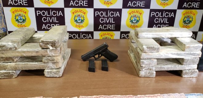 Em operação montada entre as polícias de Bujari e Rio Branco, 15kg de maconha foram localizados dentro de um tambor, enterrado na chácara de Bujari. Logo em seguida, os policiais seguiram com destino a Rio Branco. Com mandado de busca e apreensão, os homens da polícia foram a uma casa e encontraram a arma que estava escondida em um fundo falso.