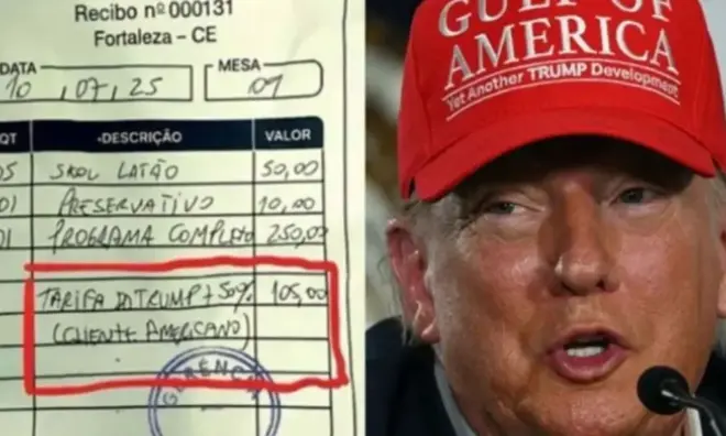 No recibo, que circulou como rastilho de pólvora nas redes sociais — especialmente no X (antigo Twitter) —, o gringo desembolsou R$ 50 por uma cerveja, R$ 10 por um preservativo e R$ 150 por um programa. Mas a surpresa veio no rodapé: mais R$ 150 adicionados como “Tarifa do Trump + 50%”. Resultado final? R$ 450. E muita risada.