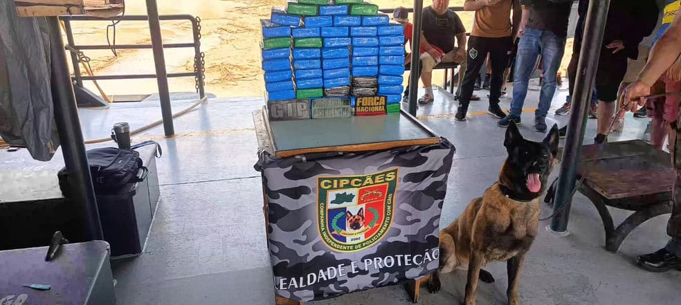 Uma cadela da Polícia Militar do Amazonas (PMAM) descobriu 60 quilos de cocaína escondidos em malas dentro de uma embarcação em Coari, Amazonas. A apreensão ocorreu na manhã desta segunda-feira (19).